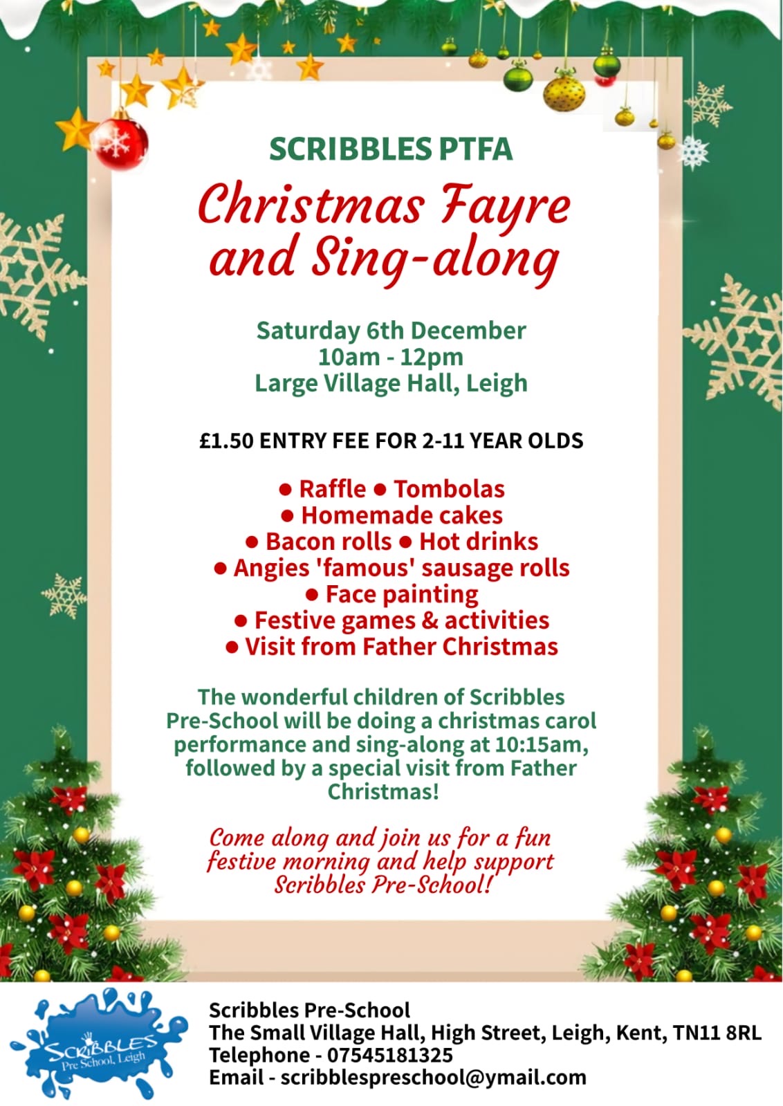 6 Dec Scribbles Christmas Fayre Large Village Hall 10am – 12pm